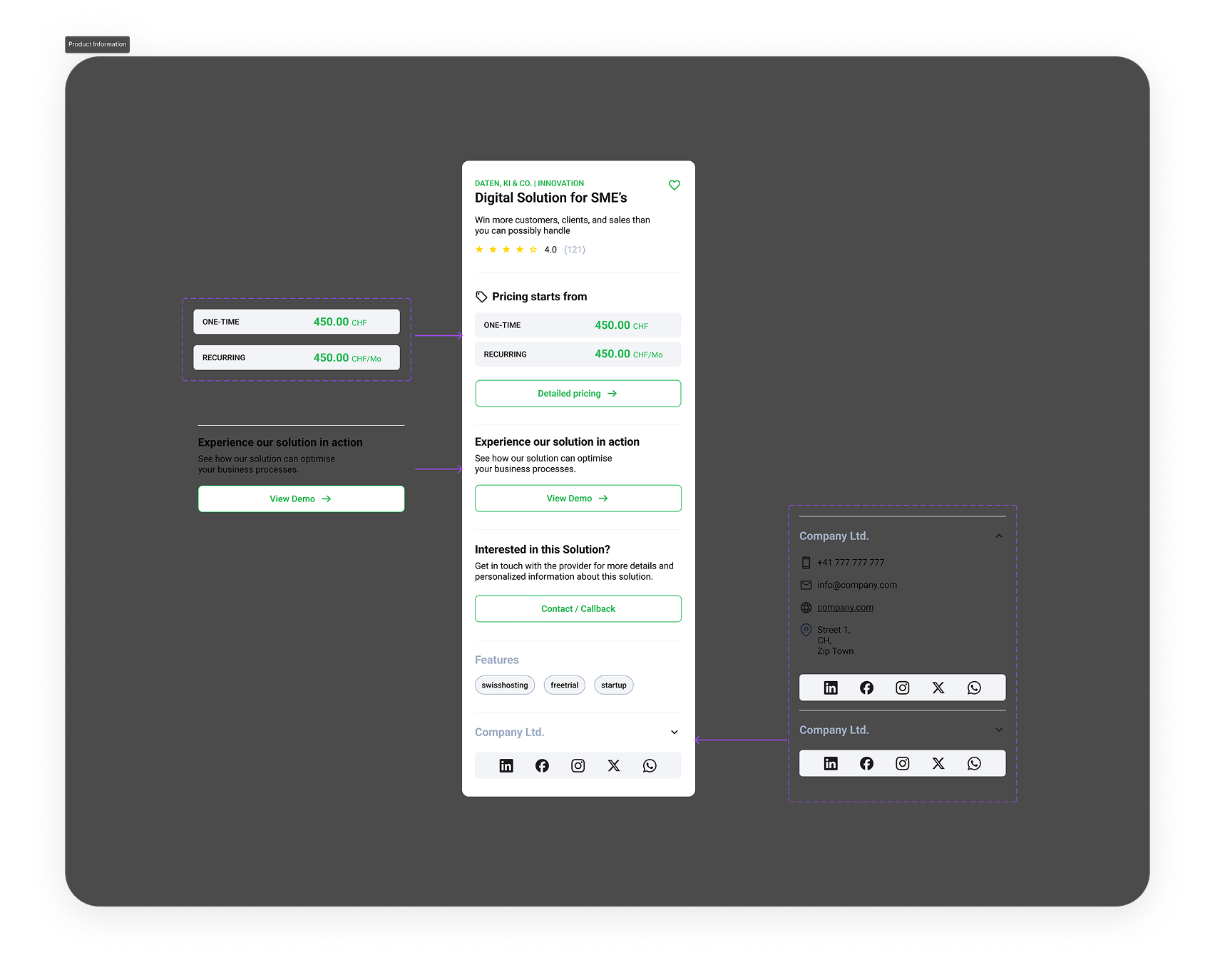 Der Research bestand aus einer klaren Analyse der bestehenden Anforderungen, einem UX Audit der Plattform sowie einer gezielten Wettbewerbsanalyse verschiedener digitaler Marktplätze. Dadurch konnten strukturelle und visuelle Muster identifiziert werden, die ein vollständiges Redesign notwendig machten. Die Erkenntnisse bildeten die Grundlage für eine neue Informationsarchitektur und ein modernes UI, das flexibel für unterschiedliche Branchen nutzbar ist.